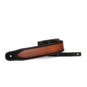 Von Hand hergestellt, so auch die Nähte ist der Gitarrengurt. Der Gitarrengurt besteht aus gegerbten Büffelleder, wobei auf den Gurt Applikationen aufgenäht sind. Die Applikationen sind aus Lachsleder. Er kommt auf eine maximale Länge von 153.5 cm, wobei die Länge einstellbar ist. Die Gurtbreite liegt bei 7 cm. Er ist mit einem Schulterpad aus Kaltschaum ausgestattet. Zusätzlich ist der Gitarrengurt mit Mikrofaser gefüttert. Die Stärke vom Gitarrengurt beträgt zwischen 8 bis 9 mm. Farblich ist der Gitarrengurt in einer Mischung aus Schwarz und Brauntönen gehalten.