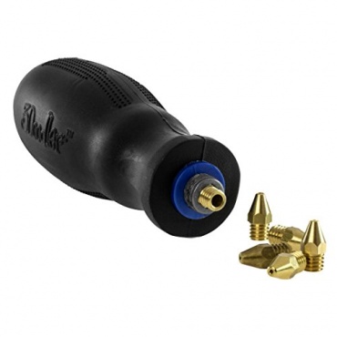 Im Set sind Düsen mit 1,5 Milimeter, sowie mit einem Milimeter und mit und 0,6 Milimeter Durchmesser enthalten. Die Düsen haben ein dreieckiges, quadratisches und flaches Profil. Mit dem Griff wird angeschraubt und er bewahrt die übrigen Düsen auf. Der 3Doodler ist eine stiftförmige Halterung mit eingebautem Extruder.