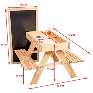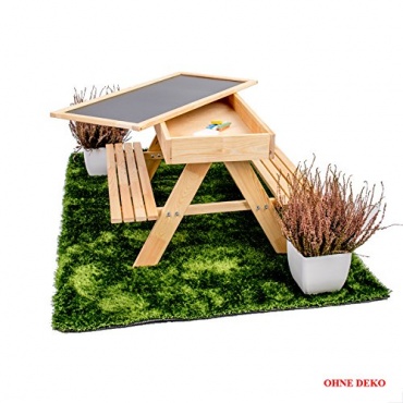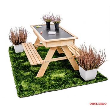DIese naturbelassene Kindersitzgruppe kann vielseitig verwendet werden. Zum Beispiel als Spieltisch, als Maltafel oder als Sandkasten. Geeigent ist die Sitzgarnitur für Kinder von drei bis acht Jahren. Der Tisch ist mit einem grossen Staufach ausgestattet und kann als Sandkasten, Stauraum oder einfach als geniales Versteck benutzt werden. Wird die Tischplatte umgedreht, dient sie als Maltafel. Diese 3 in 1 Kindersitzgruppe kann draußen im geschützten Außenbereich oder drinnen im Kinderzimmer zum Einsatz kommen.