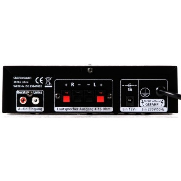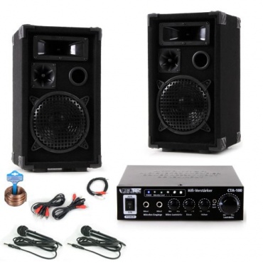 Die 600W PA Karaoke Party Kompakt Musikanlage enthält zwei Boxen DJ-Pro 8, aus denen die Musik ertönt. Dazu beinhaltet die Musikanlage einen Verstärker Chilitec CTA-100, mit dem sich das Playback und der Sänger einfach einstellen lassen können. In der Karaoke-Anlage ist ein Lautspecherkabel enthalten, das zehn Meter lang ist. Die Lautsprecherboxen der Musikanlage sind in der Farbe schwarz erhältlich.