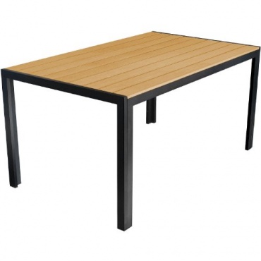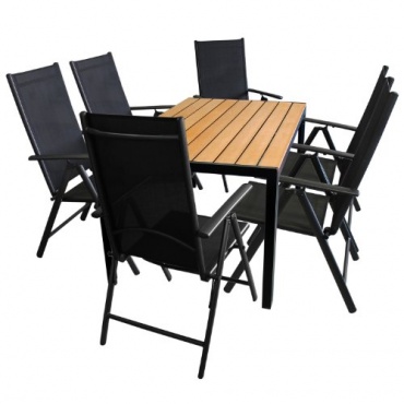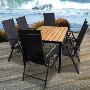 Die Gartengarnitur besteht aus sieben Teilen: einem großen Gartentisch und sechs Klappstühlen. Der Rahmen des Gartentisches besteht aus schwarzem Aluminium. Auf diesem ist eine Polywood-Tischplatte befestigt. Über zwei Füße lässt sich ein Niveauausgleich von etwa 1,5 cm realisieren. Der Tisch besitzt ein Gesamtgewicht in Höhe von 15 kg.