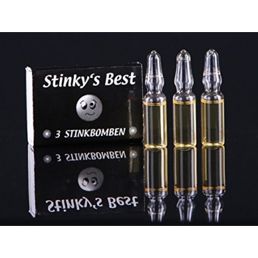 Stinky's Best garantiert für seine 9 extrem stark riechenden Stinkbomben den Verzicht auf giftigen Inhaltsstoffen und die Benutzung von welchen auf rein biologischer Basis. Dadurch wird ihre Ungefährlichkeit sichergestellt. Nach dem Bruch der Ampulle entwickelt sich eine stinkende Wolke, die zusätzlich noch wandert. Der Radius des üblen Geruchs vergrößert sich. Die Stinkbomben von Stinky's Best sind in Deutschland und Österreich zugelassen.