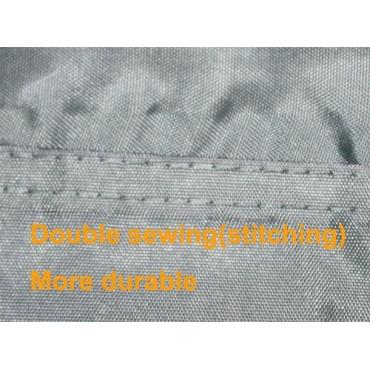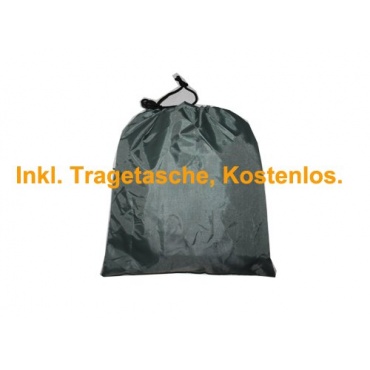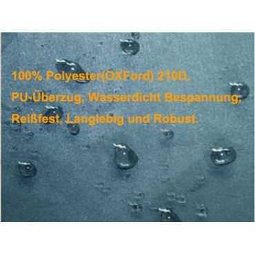 Die Haube ist aus 100 % Polyester gefertigt und mit einem PU-Überzug versehen. Dieser garantiert eine Wasserdichte der Plane. An der Innennaht ist ein Dichtband angebracht, welches ebenfalls zur Abweisung und Dichtigkeit von und vor Wasser beiträgt. Die Naht der gesamten Plane ist doppelt genäht. So wird die Plane besonders reißfest, robust und langlebig.