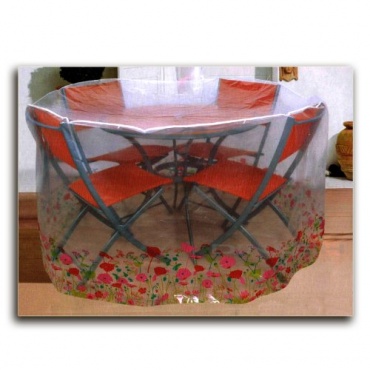 Die Abdeckhaube für Gartenmöbel von Di-Nesh 24 bietet ausreichend Schutz ihrer Gartenmöbel vor äußeren Einflüsse. Die Haube ist transparent und am unteren Rand mit einem dezenten Blumenmuster versehen. Durch die Transparenz kann stets der Zustand der darunter befindlichen Möbel begutachtet und überwacht werden, ohne die Plane immer wieder abnehmen und erneut aufsetzen zu müssen.
