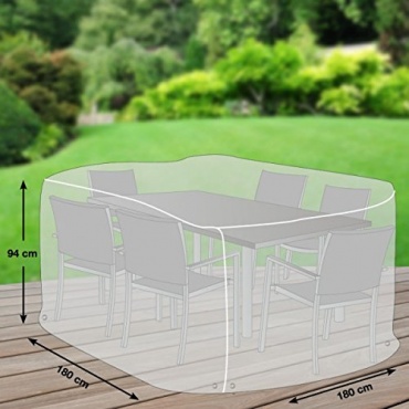 - PVC-Beschichtung auf der Innenseite, sehr stabil und robust, kann einfach und schnell über die Gartenmöbel gebracht und befestigt werden, sehr wasserfest, Aluminiumösen eingelassen, inklusive einer Befestigungskordel und Stopper, versiegelte Nähte, sehr strapazierfähiges Material, gutes Preis-Leistungs-Verhältnis, guter Schutz vor dem Wetter, UV-Schutz