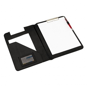 Diese schwarze Schreibmappe ist mit zahlreichen Kartenfächern und mehreren Einsteckfächern ausgestattet. Das Material aus dem sie besteht ist abwaschbar und leicht zu reinigen. Sie hat außen ein unauffälliges, modernes Muster und die beiden Ecken an der Seite sind weich abgerundet. Mit einer Größe von 32,5 x 23 x 1,5 cm lässt sie sich problemlos verstauen und passt in jede Aktentasche.
