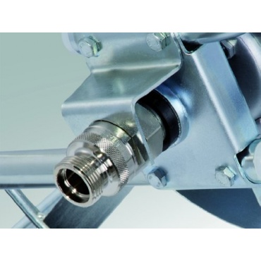 Die schlauchschonende Trommel hat einen komfortablen Anschlussbogen. Mit dieser Schlauchtrommel entsteht kein Knicken der Schläuche, sondern die unterschiedlichen Schläuche können ordentlich aufgewickelt werden. Die Trommel ist mit einer Handkurbel bedienbar. Die Dreharmatur ist kugelgelagert und sorgt damit für eine leichte Ab- und Aufrollung der Schläuche. Der Griffbügel lässt sich abnehmen. Vorteil der Trommel ist die hohe Kipp- und Standfestigkeit durch die angebrachten Beine.