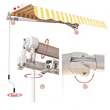 Der Markisenstoff der ALU-Gelenkarmmarkise der Firma Songmics ist aus Polyester hergestellt und mit einer wasserfesten PU-Beschichtung versehen. Optisch sehr ansprechend ist der Rahmen aus hochwertigem Aluminium, der nach der Oxidationsbehandlung lackiert worden ist. Die Gelenkarmmarkise wird bequem mit der einhängbaren Handkurbel ein- und ausgefahren. Der Neigungswinkel kann für den optimalen Schatten von 0 bis 30 Grad stufenlos eingestellt werden.