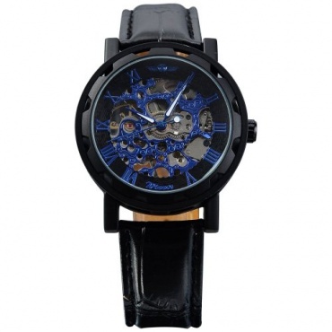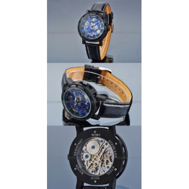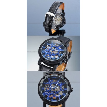 Die Herrenuhr mit dem schwarzen Ziffernblatt und dem blauen Muster wird an jedem Handgelenk zum Blickfang. Die Skelettuhr ist bis drei ATM wasserdicht. Diese Uhr bereichert das Handgelenk und macht bei jedem Blick auf die Zeit stolz. Wer diese Uhr sein Eigen nennt, hat alles richtig gemacht.