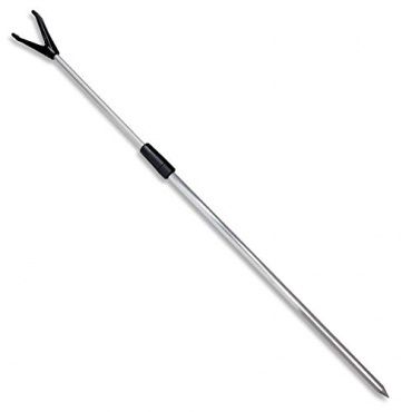 Der Erdspieß ist teleskopierbar und kann zwischen 50 und 90 cm ausgezogen werden. Ist der Rutenhalter auf die gewünschte Länge ausgezogen, wird er mit einem Drehverschluss arretiert. Einmal verschlossen, bleibt der Spieß auf die gewünschte Länge und kann durch nichts verschoben werden. Unten ist der Rutenhalter angespitzt und lässt sich leicht in den Boden bringen. Die Auflage für die Rute ist V-förmig mit einer Furche, durch die sich die Schnur leicht bewegen lässt.