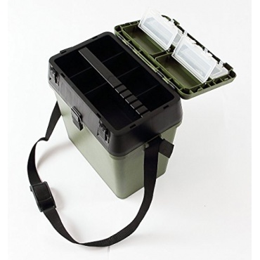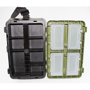 Im Inneren des Angelkoffer von Kanana findet man ausreichend Platz, um die Angelausrüstung unterzubringen. Man kann den Koffer mit einer Unterteilung in mehrere Fächer benutzen oder diese auch herausnehmen und hat auf diese Weise ein großes Fach zur Verfügung. Zwei mit Reißverschluß verschlossene Vortaschen bieten weiterhin die Möglichkeit, Kleine Gegenstände zu verstauen, die man gerne schnell zur Hand hat. In der attraktiven grünen Farbe im Tarn-Look ist der Angelkoffer auch eine wunderbare Geschenkidee für jeden, der gerne zum Fischen geht.