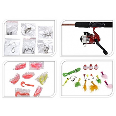 Das Angelset Komplett beinhaltet des Weiteren eine umfangreiche Sammlung an Angelutensilien.Als Köder sind diverse Gummiköder (Twister), Spinner und Nymphenimitationen beigefügt, die eine große Ködervielfalt für den Einstieg ins Spinnfischen bieten.Für das Grundangeln befinden sich im Set diverse Bleie, Schwimmer und Haken, die eine sofortige Einsetzbarkeit des Sets auch für diese Angelmethode ermöglichen.