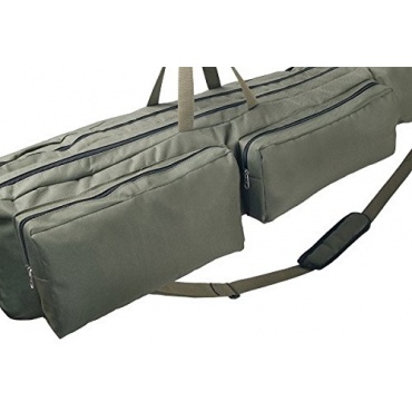 Die Angeltasche hat drei großzügig bemessene Fächer, in denen bis zu sechs vormontierte Angelruten ihren Platz finden. Verschlossen wird jedes Fach mit einem Doppelreißverschluss, dadurch können die Ruten bequem entnommen oder hereingetan werden. Auf der rechten Seite befinden sich zwei große Taschen, auf der linken Seite eine große durchgängige Tasche. Die rechten Taschen haben beide einen Reißverschluss, die linke besitzt einen verstellbaren Steckverschluss aus Kunststoff. Durch die Seitentaschen kann alles Nötige mitgenommen werden.