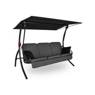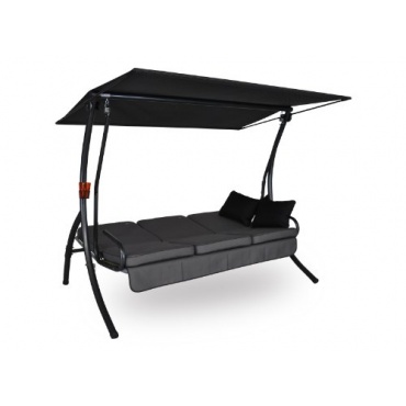 Die Lehne dieser Gartenschaukel kann abgeklappt werden, so dass aus der Sitzfläche eine großzügige Liegefläche wird. Bei der Hollywoodschaukel haben diese drei Kissen eine Stärke von 8 cm und man kann sie auch beidseitig verwenden. Diese äußerst robusten Sitzbezüge bestehen aus 100% Polyacryl und Dralon, was für ein bequemes Sitzen sorgt. Rechts und links befindet sich jeweils noch ein Seitenkissen. Das antrazit farbene Sonnendach der Hollywoodschaukel ist leicht abwaschbar.