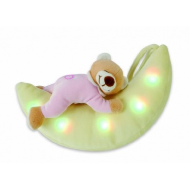 Mit diesem niedlichen Schlummerlicht erwirbt man auch gleichzeitig ein Kuscheltier und eine Spieluhr. Der süße Bär liegt auf dem Mond, der mit Hilfe LED Lichtern beleuchtet wird. Auf Wunsch kann noch eine der drei Lieder (Guter Mond, Schlaf Kindlein schlaf und Guten Abend, gute Nacht) zugeschaltet werden.