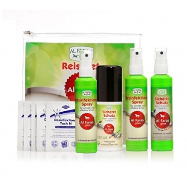 Aqua Clean Al Faras Universal Insektenschutz (gegen Insekten)wird in einem praktischen Set angeboten, das ideal auf Reisen ist. Es beinhaltet zwei Aqua Clean Al Faras für Oberflächen, sowie zwei Aqua Clean Al Faras speziell für die Haut, ein Desinfektionsspray und fünf Feuchttücher, mit denen man schnell desinfizieren kann.