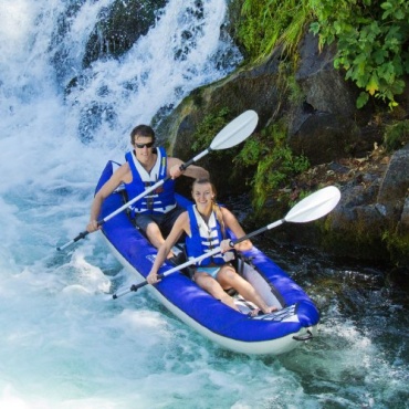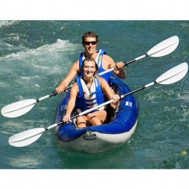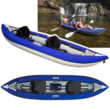 Dieses attraktive Kajak hat eine stabile und effiziente Rumpfform. Es bietet ausreichend Platz für zwei Paddler mit Angelausrüstung und einem Kind. Die Abmessungen des Tandem sind eine Länge von 390 Zentimeter, sowie eine Breite von 86 Zentimeter. Das Gewicht beträgt 14,4 Kilogramm. Das Tandem Kajak zum Aufblasen kann eine Kapazität von 250 Kilogramm tragen.