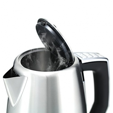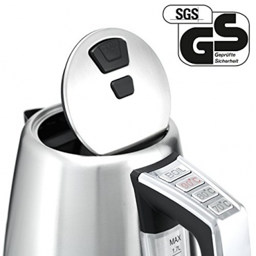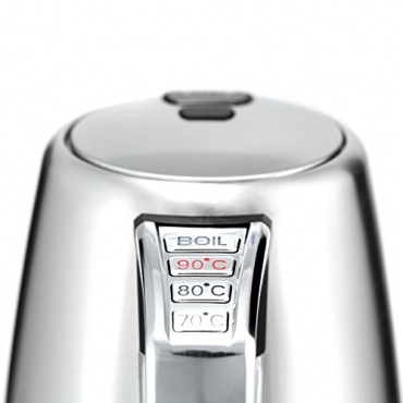In edler Chrom-Optik ist eine Menge Technik verhüllt. Die digitale Temperaturkontrolle mit vier frei wählbaren Temperaturstufen 70° / 80° / 90° / 100° erlaubt insbesondere Teeliebhabern gradgenaues Aufbrühen. Das Erreichen der Zieltemperatur wird durch einen Signalton hörbar. Verzögert sich das Aufbrühen, zeigt das Gerät sogar die noch vorhandene Temperatur an. Ein 360° drehbarer Kontaktsockel mit integrierter Kabelaufwicklung ist bequem für Rechts- und Linkshänder. Als praktisch erweist sich der OneTouch-Verschluss.