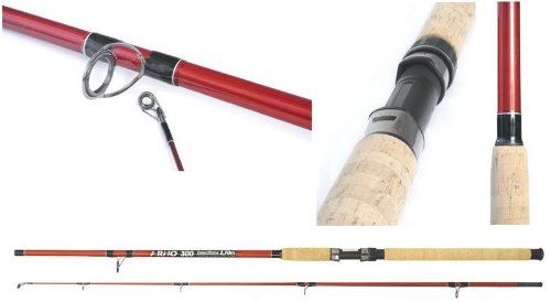 Vollständig aus Composit und mit einem Griff aus Kork versehen ist die Steckrute. Die Steckrute besteht aus zwei Teilen, lässt sich einfach zusammenstecken und kommt auf eine Rutenlänge von 2.40 m. Durch den Korkgriff liegt die Angelrute sehr weich und angenehm in der Hand. Geliefert wird sie ohne Angelrolle, dafür ist die Steckrute mit sechs Ringen ausgestattet. Farblich ist die Composit Angelrute in einem roten Design gehalten. Mit der Angelrute kommt man auf ein Wurfgewicht von 200 bis 300 Gramm.