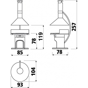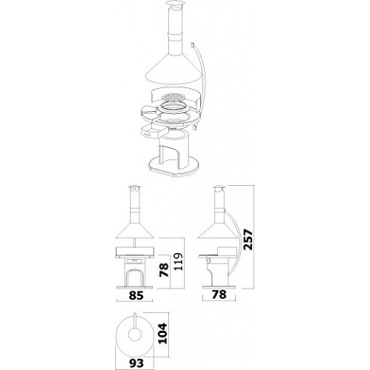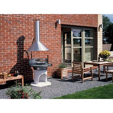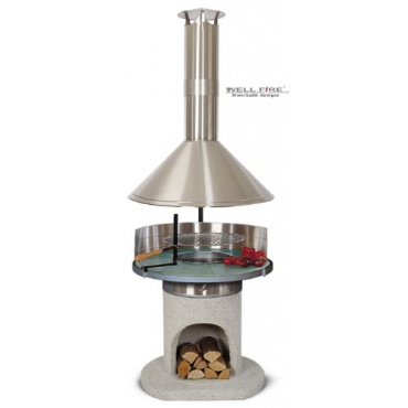 Zum Beheizen kann Kohle oder Holz verwendet werden, wobei die Ascherückstände in einem Kasten aufgefangen werden. Der Grillkamin hat eine runde Form. Er ist mit einem drehbaren Grilltisch und schwenkbarem Grillrost ausgestattet. Die äußere Arbeitsplatte ist mit Keramikfliesen belegt. Grillrost, Schwenkarm, Windhaube und Rauchrohr sind aus Edelstahl.