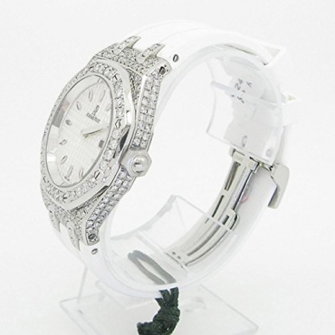 Das Gehäuse der Luxusuhr ist aus Stahl gefertigt und in Kombination mit dem bruchsicheren Saphirglas ist die Audemars Piguet Lady Royal Armbanduhr wasserdicht bis zu einer Tiefe von 50 Metern. Im silbernen Ziffernblatt, ist eine kleine Datumsanzeige integriert. Das Stahlgehäuse ist um das Glas herum mit kleinen funkelnden Steinen besetzt, was der Luxusuhr zu einen zusätzlichen Charme einen Hauch von purem Luxus verleiht.
