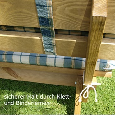 Das dekorative Auflagenset BOSTON für Gartenmöbel ist aus 100 Prozent Baumwolle gefertigt und bei 30 grad waschbar. Die grün-karierte Auflage verfügt über eine FCKW-freie Füllung und kann mittels Reißverschluss ganz einfach aus dem Bezug genommen werden. Das praktische Auflagen-Set umfasst ein Sitz- und ein Rückenpolster. Mit den angebrachten Klettbändern wird das Rückenpolster i Handumdrehen am Rückenteil der Bank befestigt.