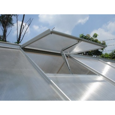 Dieser Fensteröffnung benötigt keinen Strom. Für die automatische Öffnung kann man einen Temperaturbereich von 13 bis 34 Grad auswählen. Die Montage ist einfach und kann je nach Gewächshaus angepasst werden. Die Öffnung erfolgt mittels Hubzylinder. Durch die Automatik sind die Pflanzen gut aufgehoben und werden bei höheren Temperaturen gut durchlüftet.