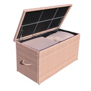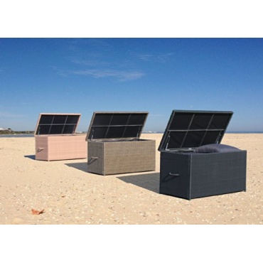 Die Kissenbox Lounge XXL - Brasil ist ein sehr große und robuste Box für Auflagen und Kissen. Sie hat ein stabiles Alu Gehäuse und einen Poly Rattan Look. Der Deckel lässt sich sehr leicht öffnen und mit einem Scharnier feststellen so das die Box beladen und entladen werden kann, ohne sich die Finger zu klemmen. An den Seiten der Box befinden sich zudem noch zwei Tragegriffe so kann die Box leicht transportiert werden. Die Lieferung der Box erfolgt zerlegt der Aufbau ist aber ausführlich in der Gebrauchsanweisung nach zu lesen.