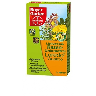Der von Bayer hergestellte Rasen Unkrautvernichter Loredo Quattro in der 400 Milliliter Flasche ist breit wirksam gegen hartnäckige Unkräuter im Rasen, wie Hornkraut, Gemeine Braunelle, Gundermann und Ehrenpreis. Über die Blätter wird der vierfache Wirkstoffmix von den Unkrautpflanzen aufgenommen und wirkt nachhaltig durch eine wurzeltiefe Wirkung. Dieses Mittel vertragt der Rasen ohne Probleme und ist auch nicht für Bienen gefährlich.