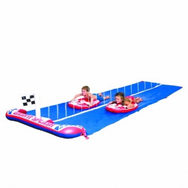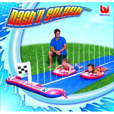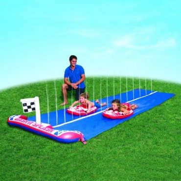 Gerade wenn der Sommer kommt, eignet sich die Kinderrutsche Dashn Splash Ralley Pro vom Hersteller Bestway. Bei dieser Kinderrutsche handelt es sich um eine Wasserrutsche die von zwei Kindern gleichzeitig genutzt werden kann. Die Kinderrutsche muss nur aufgeblasen werden und der Gartenschlauch angeschlossen werden. Für die Aufstellung der Kinderrutsche benötigt man einen größeren Platz im Garten.