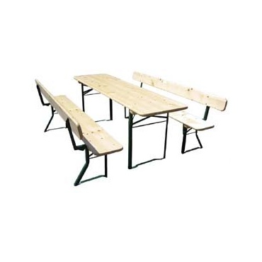 Aus zwei Materialien, nämlich aus Eisen und Holz gefertigt ist die Biergartengarnitur. So besteht das Untergestell sowohl beim Tisch als auch bei den zwei Bänken aus Winkeleisen. Die Untergestelle sind zum Witterungsschutz pulverbeschichtet in einem dunkelgrünen Farbton. Die Oberfläche, sowohl bei den Bänken als auch beim Tisch besteht aus Fichtenholz. Auch die Holzoberflächen sind entsprechend behandelt und bieten einen Witterungsschutz. Als Besonderheit sind die beiden Bänke bei der Biergartengarnitur mit einer Rückenlehne ausgestattet. Die Abmessungen der Biergartengarnitur betragen 220 x 67 cm.
