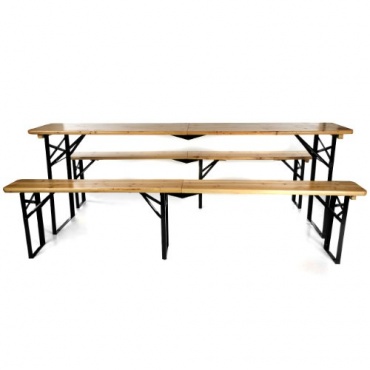 Die Bänke der Bierzeltgarnitur haben mit dem schwarzen Drei-Fuß-System einen festen und sehr sicheren Stand. Die Scharniere mit Einrastfunktion sind robust und trotzdem leicht zu öffnen und zu schliessen an Tisch und Bänken. Egal ob zu Geburtstagen, Partys oder anderen Events, die Bierzeltgarnitur ist rasch aufgebaut und lädt zum gemütlichen Sitzen ein. Die Garntiur besteht aus massivem Kiefer und Fichte Holz.