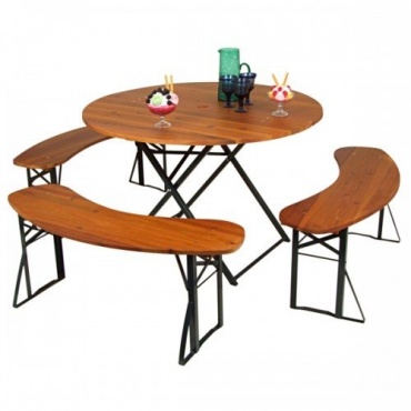 Die zusammenklappbare Sitzgarnitur der Firma 1a-Handelsagentur besteht aus einem Set mit Tisch und drei Bänken. Die runde Tischplatte mit einem Durchmesser von 115 cm hat ein 5 cm großes Loch zum einsetzen eines Sonnenschirmes. Die Bänken sind ebenfalls abgerundet und bieten Platz für je drei Personen. Das stabile Metall-Gestell besitzt inklusive der Tischplatte eine Höhe von 74 cm. Die Tischplatte sowie die Sitzflächen der Bänke bestehen aus robustem Holz. Die Sitzhöhe beträgt 46 cm.