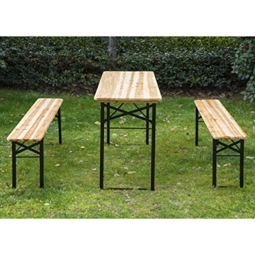 Die Bierzeltgarnitur von Outsunny ist an das klassische Design angelehnt. In der dreiteiligen Garnitur sind zwei Bänke und ein Tisch enthalten. Die Sitzflächen und die Tischplatte sind aus massivem Holz gefertigt und ruhen auf robusten Metallfüßen. Die komplette Garnitur lässt sich zusammenklappen und so platzsparend verstauen und auch gut transportieren. Da Zwei Bänke genau nebeneinander auf feinen Tisch passen, können auch mehrere Bierzeltgarnituren übereinander gestapelt werden. Dies bietet sich sowohl für eine optimierte Lagerung, als auch für den Transport an.