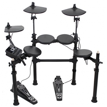 Zum Set gehören 3 Pads Tom, 3 Pads Becken und 1 Pad Snare. Auch ein Pedal Basstromel, 1 Modul und 1 Pedal HiHat sind im Lieferumfang enthalten. Zu den Details des Moduls zählen 10 Kits Songs, von denen 30 voreingestellt sind, 64 Drum Kits sowie 12 Loop Lernen und Üben. Ebenso ist ein dreistelliger LED Mixer enthalten.