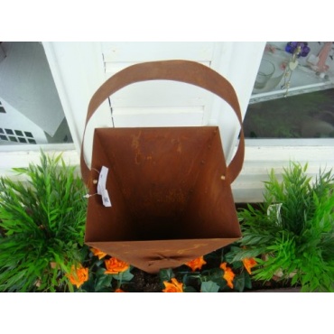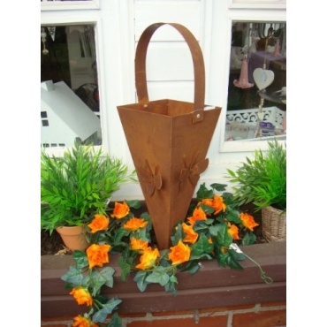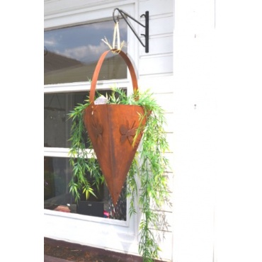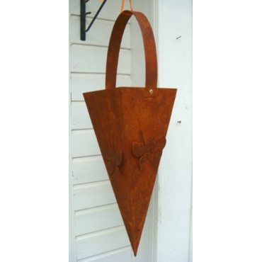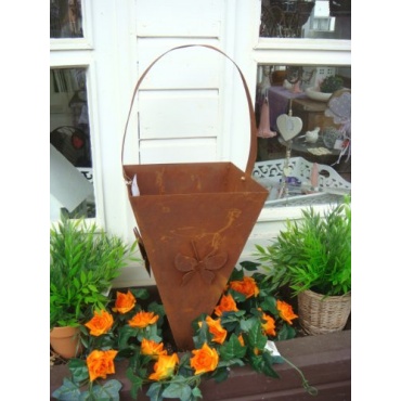 In dieser Pflanztüte kommen ganz besonders hängende Pflanzen gut zur Geltung, da ein besonderer Kontrast gebildet wird. Die blühenden grünen Blätter einerseits, das rostige Aussehen der Blumenampel andererseits.