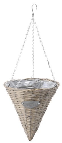 Der Pflanzkorb aus Weide ist an drei Ketten befestigt, die zart wirken und dennoch stabil sind. Die Ketten haben eine Länge von 30 Zentimetern und laufen am oberen Teil in einem Haken zusammen, mit dem sie an der Decke befestigt werden können. Auf der vorderen Seite ist der Korb mit einer Plakette in der gleichen Farbe der Kette verziert. Die Blumenampel aus Weide kann der Witterung widerstehen und deshalb auch das ganze Jahr über im Freien verbleiben