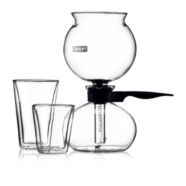 Der Pebo Vakuum Kaffeebereiter von Bodum macht Kaffeekochen zum absoluten Erlebnis, denn im Gegensatz zu anderen Kaffeemaschinen läuft das Wasser nicht einfach von oben nach unten durch das Kaffeepulver. Der Pebo Vakuum Kaffeebereiter besteht aus zwei runden Glasbehältern, welche mit einem Glasstab verbunden sind und ineinander gesteckt werden. Die gewünschte Wassermenge wird in die untere Kanne gefüllt und das Kaffeepulver in die obere Kugel. Dann muss nur noch der Deckel aufgesetzt und der exklusive Kaffeebereiter auf den Herd gestellt werden.