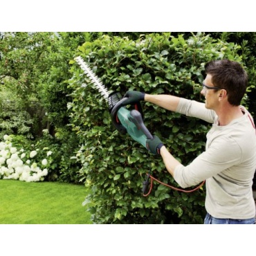 Diese Heckenschere kann unter anderem für den Einsatz beim Schneiden von hochgewachsenen Hecken in Aktion treten. Aufgrund des Hochleistungsmotors mit 600 Watt ist sie sehr robust und überzeugt mit effektiven Schnitten. Das Messer ist Laserstahlgeschnitten mit dem Verfahren des Diamentenschleifens. Es gibt die Option mehrer Schalterstellungen zu nutzen und somit in jeder Arbeitsposition tätig zu werden. Die Verarbeitung des Griffs und die Nutzung in der Hand beim Arbeiten erleichtern die Arbeitsabläufe.