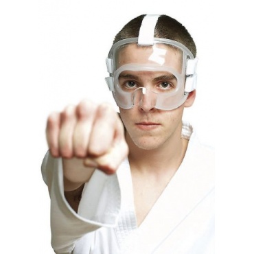 Budoten Karate-Kopfschutz WKF approved L ist eine hochwertige transparente Gesichtsmaske, die aus bruchsicherem hochwertigen Kunststoff gefertigt wurde, Die Maske kann mittels eines speziellen Befestigungsriemen mit Klettverschlüsse individuell angepasst werden und sitzt im Anschluss wie angegossen. Diese Gesichtsschutzmaske ist für Karate-Wettkämpfe entwickelt und genügt den neusten WKF Wettkampfregeln. Durch die Transparenz der Maske kann der Kampfrichter den Teilnehmer gut sehen.