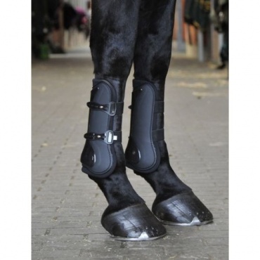 Die Außenschalen der Gamaschen und der Streichkappen sind schlagfest. Sie haben eine stoßfeste Hartschale und schützen somit optimale die Beine des Pferdes. Zusätzlich wurde an den Gamaschen an den gefährdeten Stelle eine Polsterung angebracht. Sie wurden anatomisch geformt, so dass sie gut an der Fessel des Pferdes anliegen.