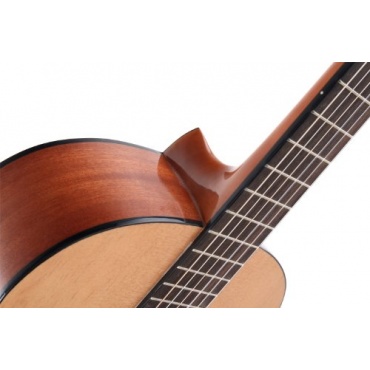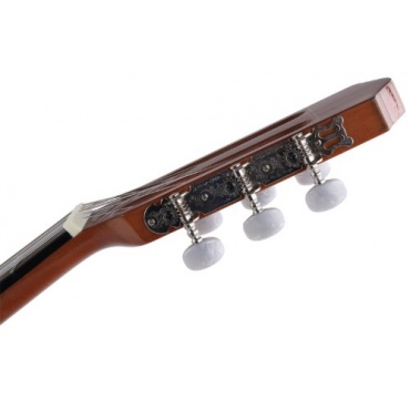 Der Korpus der Calida Loretta CL34N Konzertgitarre ist aus Zedernholz gefertigt und der Boden sowie die Zargen sind aus Mahagoniholz hergestellt. Diese Konzertgitarre hat 18 Bünde und die sechs Saiten sind aus Nylon. Die Bundmarkierungen sind am fünften und siebenten Bund angebracht.