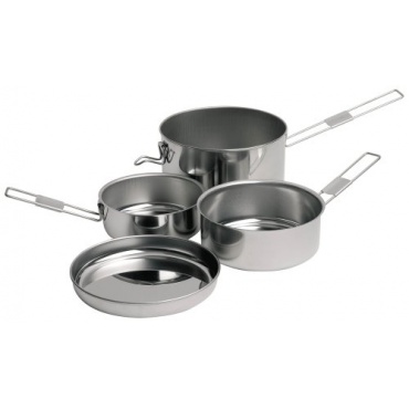 Hochwertiger Edelstahl und die praktische Möglichkeit alle Töpfe platzsparend ineinander zu stapeln zeichnen das Campingaz 202029 Campinggeschirr Trekking-Geschirrset aus. Die Griffe sind leicht zu fixieren und der enthaltene Deckel passt auf alle Töpfe. Er kann zusätzlich als Teller verwendet werden. Geliefert werden drei Töpfe mit unterschiedlichen Fassungsvermögen. Der größte Topf hat ein Fassungsvermögen von 1, 5 Litern.