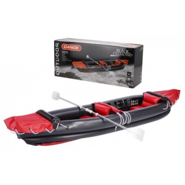 Das rot-schwarze aufblasbare Canoe Kanu wird mit reichlich Zubehör geliefert. Zwei Paddel, und die aufblasbaren Sitze, sowie die Sicherheitsventile sorgen für einen ungetrübten Spass. Das drei Meter lange Boot kann einen maximale Traglast von circa 160 Kilogramm aufnehmen.