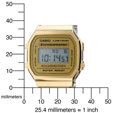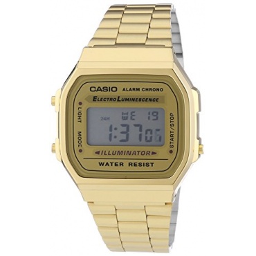 Das japanische Elektronikunternehmen Casio ist mit seiner Produktpalette global vertreten. Praktische, an Kundenanforderungen orientierte und mit modernster Technologie umgesetzte Uhren, Rechner und Kameras sorgen für Zuspruch und verlässliche Qualität. Als einer der ersten Hersteller brachte Casio 1974 erste Digitalarmbanduhren auf den Markt, mit vielen Funktionen auf kleiner Fläche. Die goldene Armbanduhr Digital Quarz A168WG-9EF aus der Casio Collection wirkt wie ein Klassiker im Retro-Look.