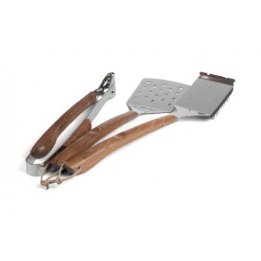 - Das Grillbesteckset ist äußerst edel. Exquisites Rosenholz und robuster Edelstahl zieren es. Mit drei Teilen liefert es eine grundständige Ausstattung.