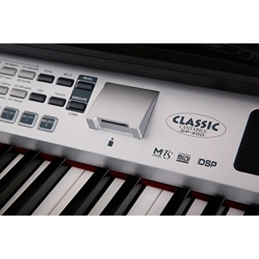 Aus Holz ist das Classic Cantabile DP-400 schwarz matt Digitalpiano gefertigt. Das Digitalpiano im schwarzen Design verfügt über 88 Tasten, 3 Pedale und über 64 verschiedene Stimmen. Das Digitalpiano verfügt über einen Speicher von über 100 bekannte Liedern, die man nachspielen kann. Wahlweise können diese Lieder laut oder über einen beigefügten Kopfhörer abgespielt werden. Zusätzlich verfügt das Piano über ein SD-Slot, so kann man eine Speicherkarte anschließen. Zum Classic Cantabile DP-400 schwarz matt Digitalpiano gehört umfangreiches Zubehör wie zum Beispiel ein Lern-CD, ein Notenheft und eine passende Pianobank. Das Gewicht vom Piano beträgt 59 kg.