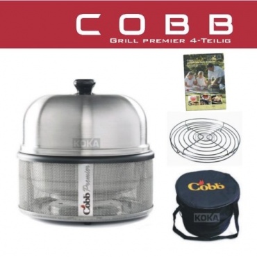 Das Premier Starter-Set von Cobb (Modell: B00IKGGDDY) enthält neben dem Grill und dem Bratenrost eine Tasche und das Buch "Grillen wie kein anderer". Die Grillplatte hat einen Durchmesser von ca. 30 cm und ist aus Edelstahl mit Antihaftbeschichtung. Mit dem Grill kann eine Temperatur von 280 bis 300 Grad erreicht werden.