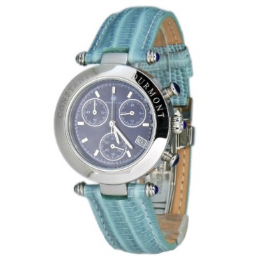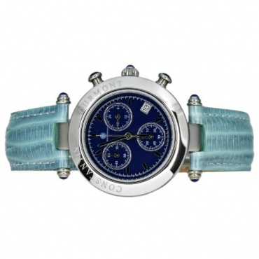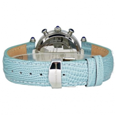Die Constantin Durmont Damen Armbanduhr Visage zeigt sich in einem eleganten Design, mit kompakter Größe. Das glänzende Edelstahlgehäuse ergänzt mit seinen blau akzentuierten Bedienelementen das dunkelblaue Ziffernblatt. In einem helleren Blau hingegen fällt das Armband des Modells CD-VISL-QZ-LT-STST-BL aus. Hier erinnert die Farbe eher an ein helles Türkis-Blau. Die Reptilienhautoptik des Armbandes wurde gut umgesetzt.