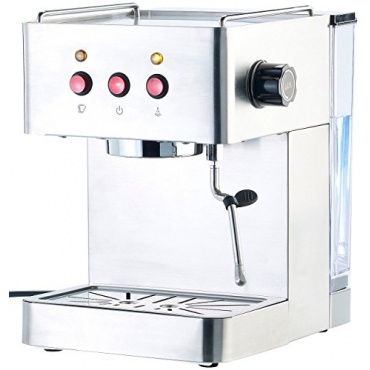 Die Maschine die ausgestattet ist mit einem Tassenwärmer, einer Wärmeplatte für mehrere Tassen und einem Drehregler für Dampferzeugung und frei wählbare Brühwassermenge. Eine vereinfachte Reinigung bringt der entnehmbare Wassertank, die entnehmbare Wärmeplatte, Abtropfgitter und -schale. Die Maschine verfügt über eine LED Betriebsanzeige, das Bedienungsfeld verfügt über eine Dampf-Taste, eine Espresso-Taste und Taste zum An- und Ausschalten. Der Lieferumfang beträgt außer der Espresso-Maschine einen Kunststoff Dosierlöffel mit Tamper und eine Anleitung.